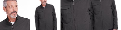 76% nylon/14% polyester/8% spandex woven stretch softshell; water-resistant; 4-way stretch; adjustable cuffs with gusset; secure hand pockets with snap closure; chest pocket with snap closure; slight drop tail hem;