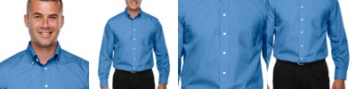 3.5 oz./ydý / 115 gsm, 55% cotton, 45% polyester broadcloth; fine yarn count shirting; true Non-iron performance straight from the dryer; stain release finish; Classic Fit for professional appearance; pearlized buttons; patented pucker-free taped seams; specially fused collar, cuffs and placket; bias cut back yoke; straight collar; left-chest pocket;