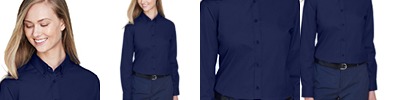 3.4 oz., 55% cotton, 45% polyester; Fine yarn count shirting; True Non-iron performance straight from the dryer; stain release finish; Active Fit; Patented pucker-free taped seams; Fused collar, cuffs, and placket; Split back seam with bias cut back yoke; straight collar; pearlized buttons; front and back princess seams for a flattering feminine fit; bust darts for a flattering feminine fit;