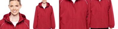 2.8 oz., abrasion-resistant 100% nylon taslan shell with polyurethane coating for enhanced wind- and water-resistance; 2.95 oz., 100% polyester dyed-to-match tricot big hole mesh lining in body; 1.7 oz., 100% polyester taffeta lining in sleeves; roll-away three-piece hood with 1¼" rain bill; Black 3/8" taping adds contrast to back and sleeves; EZEM zipper in back lining for easy decoration access; center front/lower pockets with molded plastic zipper with garage;
