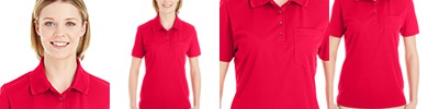 4.1 oz/yd² / 139 gsm, 100% polyester piqué with moisure-wicking, anti-microbial and UV protection performance; Matching flat-knit collar; Four-button narrow placket for feminine look; Side slits;