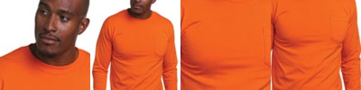 5.4 oz., 50% cotton, 50% polyester; Open-end yarn; Full cut; Shoulder-to-shoulder taping; Left-chest pocket; Double-needle bottom hem; Made in the USA;