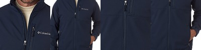 100% polyester Nexegen contour bonded soft shell; 100% polyester chamois touch tricot lining; Water-and-wind resistant; Abrasion-resistant chin guard; Adjustable cuffs; Adjustable drawcord at bottom hem; Zippered chest pocket; Zippered hand pockets; Embroidered Columbia logo on left chest;