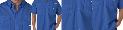 3.8 oz., 100% cotton poplin; Performance fishing gear; Self-adhesive collar points; Vented; Utility loop; Columbia PFG logo patch on rod holder on left chest; PFG logo patch on center back;