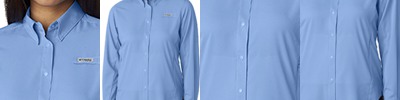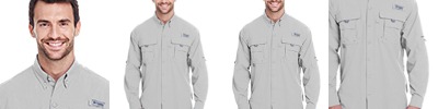 3 oz., 100% Tactel® nylon taffetta back country cloth; Quick dry; Omni-Shade™ UPF 50 sun protection; Performance fishing gear; Button-down collar; Roll-up sleeves with tab holders; Vented; Utility loop; Columbia PFG logo patch on rod holder on left chest; Embroidered Omni-Shade logo on upper left sleeve; PFG logo patch on center back;