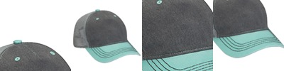 100% cotton twill pigment dye, garment washed front panels; Mesh back panels; Charcoal grey front panels & visor with light grey mesh back panels; Contrast color visor with matching sewn eyelets on the front panel and top button; 5-Panel; Unstructured low-profile crown; Grey plastic snap back closure;