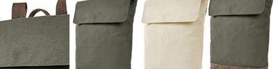 53% cotton canvas/43% polyester/4% polyurethane leather base; Cotton webbing, adjustable back straps and top carry handle; Zipper closure main compartment w/flap and magent closure; Inside lining with interior zipper pocket; Width 11" (not including gusset), Height 16"; Side seam to side seam 14.75"; Gusset 3.75"; Flap from back seam to front 8". Folded over top approx. 5" high;