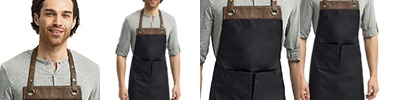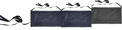8 oz., 70% cotton, 30% polyester twill; contrast stitching; antique brass and silver rivets; four pocket compartments; 42" long self fabric ties; 16" L x 31"W; Oeko-Tex® Standard 100 certified; WRAP certified;
