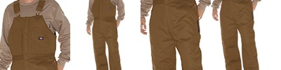100% cotton; Water repellent; Dickies ScuffGard; Double knees; Zip-to-waist for easy On/Off; Shoulder strap elastic and elastic at waist; The color number refers to the waist size in inches, while the size refers to inseam length in inches;