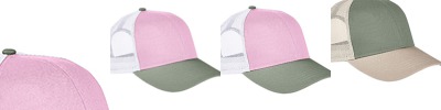 100% cotton twill front panels, bill; 100% polyester mesh back panels; 6-panel, structured; Contrasting front panels and bill, top button matches bill; Pre-curved bill; No eyelets; Two-tone snapback closure;