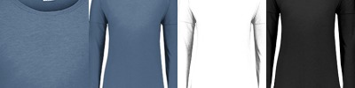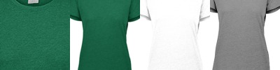 4.5 oz., 60% combed ringspun cotton/ 40% polyester fine jersey; 4.5 oz., 100% combed ringspun cotton jersey; Easytear™ label; contrasting topstitched self-fabric sleeve stripes; double-needle hemmed sleeves and rounded bottom; sideseam construction; fit: ladies' modern - semi-fitted ; taped neck; v-notch with raw serge finished edge;